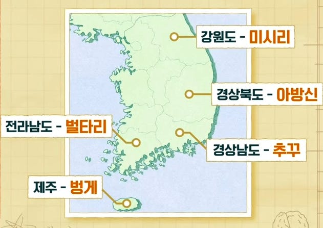The words denoted in orange are different dialects of the same word. What is the standard word that you all know? was the question. The answer was 바보 (stupid, idiot). As you can see, there are no two words that are alike. Since I’m from 경상남도, the southeast, I knew right away what 추꾸 was, although I haven’t used or heard of it for over 40 years. Boy, did that word bring back memories…