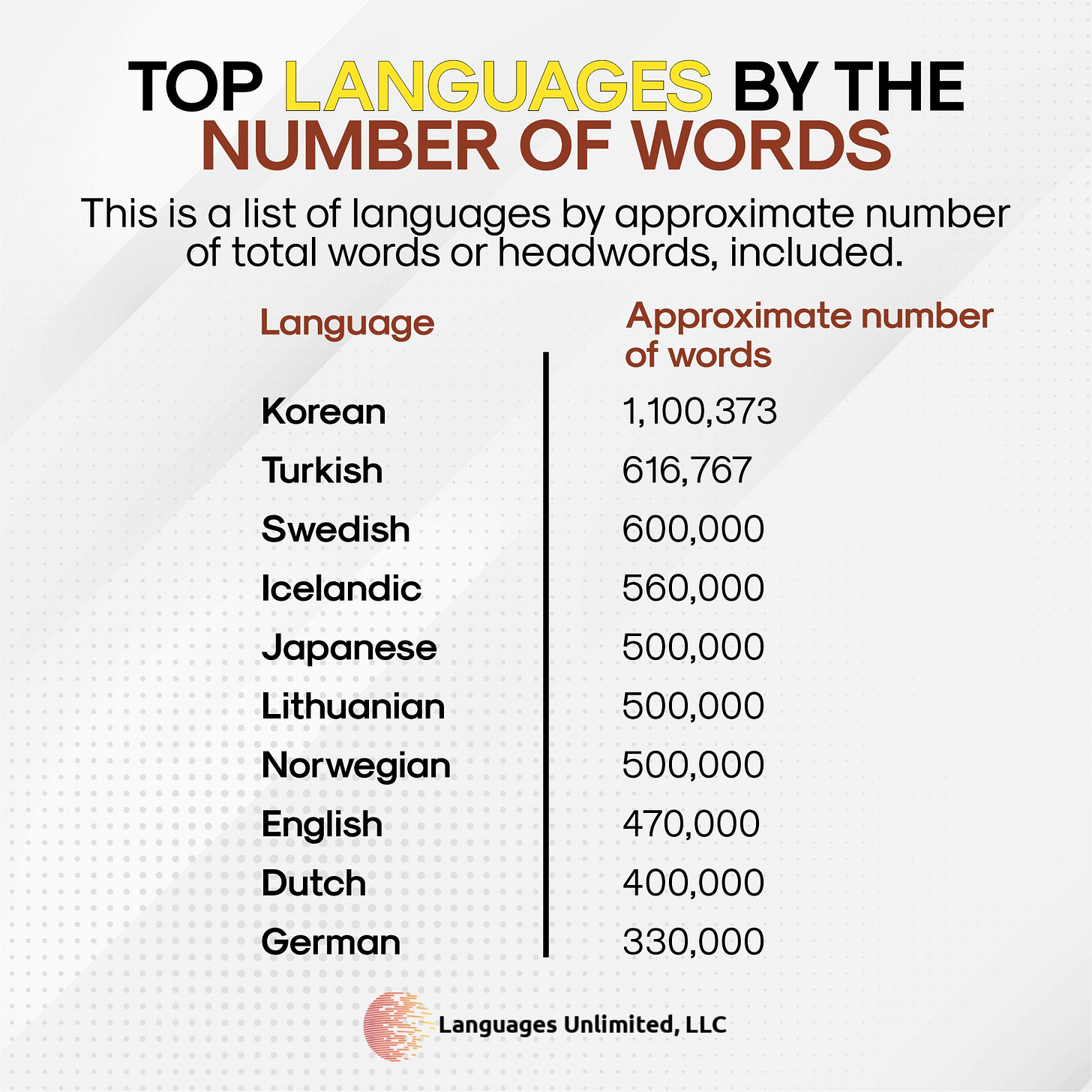 Almost twice as many as the language with second most words. I knew Korean would be up there on a list such as this, but I had no idea it would be at the top. By a wide margin, no less.